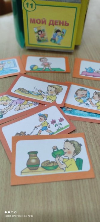 Материал: 3-4 комплекта карточек с изображениями разных режимных моментов.