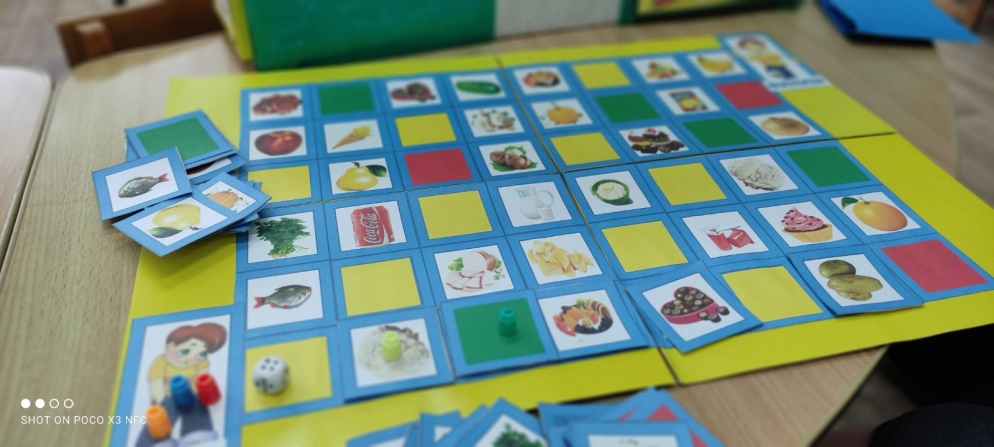 Материал: для игры имеется игровое поле, фишки, кубик, маленькие карточки с изображением продуктов.