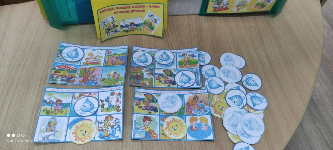 Материал: большие карты с картинками о закаливании организма солнцем, воздухом, водой, маленькие карточки «солнце», «воздух», «вода».