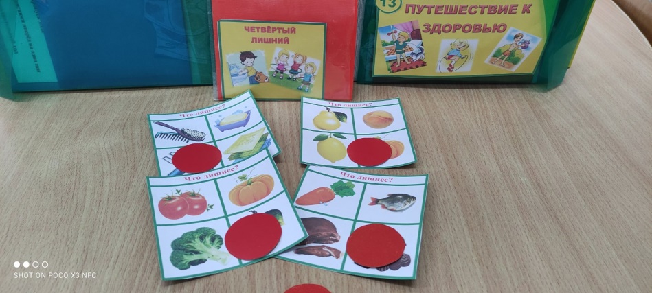Содержание игры. Воспитатель раздаёт детям карточки, на которых изображены предметные картинки, и одну цветную карточку. Объясняет, что на каждой карточке есть один лишний предмет, его необходимо определить и закрыть цветной карточкой. Далее дети по очереди называют, какой предмет у них оказался лишним и почему.