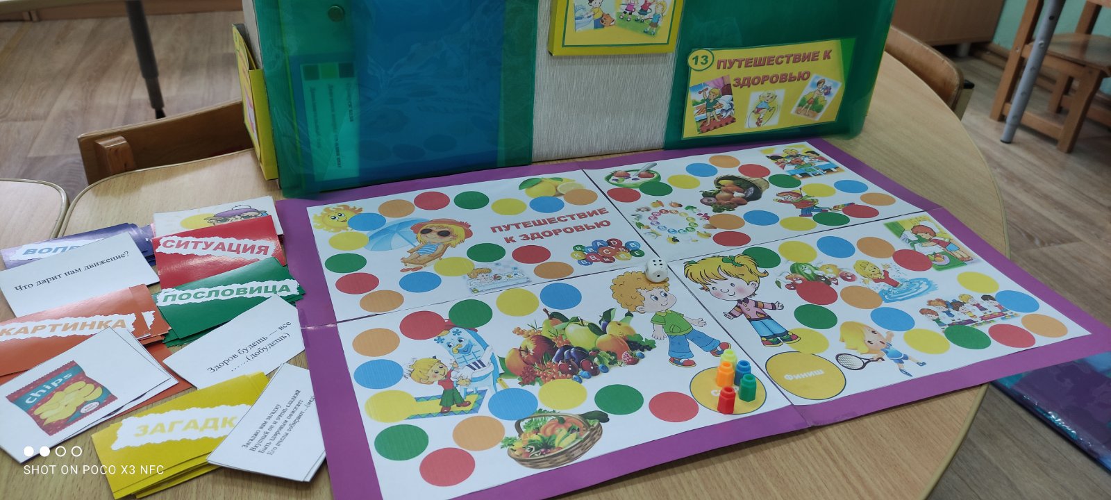Материал: игровое поле, кубик игральный, разноцветные фишки, карточки «Вопрос», «Загадка», «Пословица», «Ситуация», «Картинка».