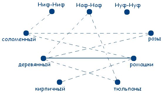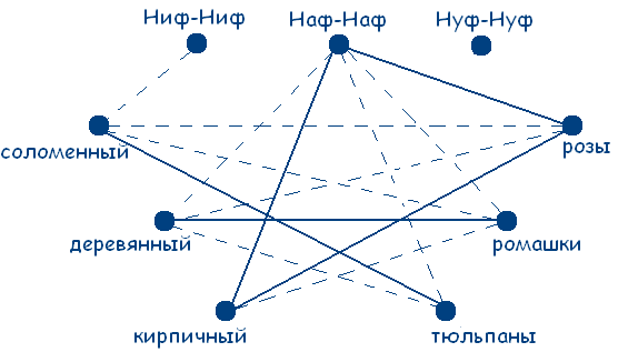 Можно сделать вывод, что возле кирпичного домика растут розы, а возле соломенного – тюльпаны. А так как Наф-Наф живет не в деревянном домике, то он и не выращивает ромашки. А так как на тюльпаны у него аллергия, то он может выращивать только розы. Внесем эти данные в чертеж и получим: