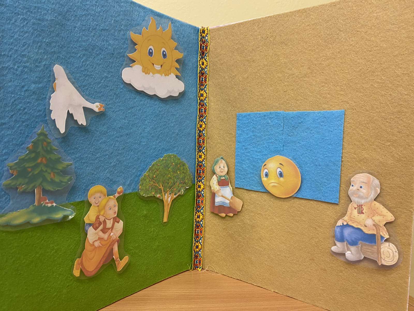 Ход: детям предлагается книга, отделанная внутри фетром и разделенная на две части. Первая часть представляет собой фоновое покрытие улицы, а вторая комнату дома. В наборе игры имеются разнообразные фигурки сказочных персонажей, имеющие липкие крепления. С помощью этих фигурок ребенок пересказывает знакомую историю или придумывает свою собственную. Можно предложить ребенку придумать сказку из двух знакомых. Задача педагога следить за правильностью произношения и согласования слов в предложениях.