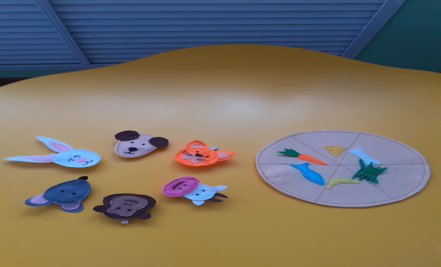 Материал: вырезанные из фетра изображения животных (мордочки, приклеенные на прищепки), круг из фетра с изображением еды животных (по секторам).