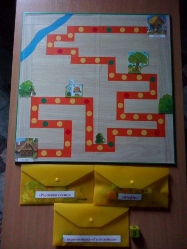 На поле № 2 расположены картинки из сказки «Гуси-лебеди» и дорожка из самоклеющейся пленки. Это поле помогает провести с детьми три игры.