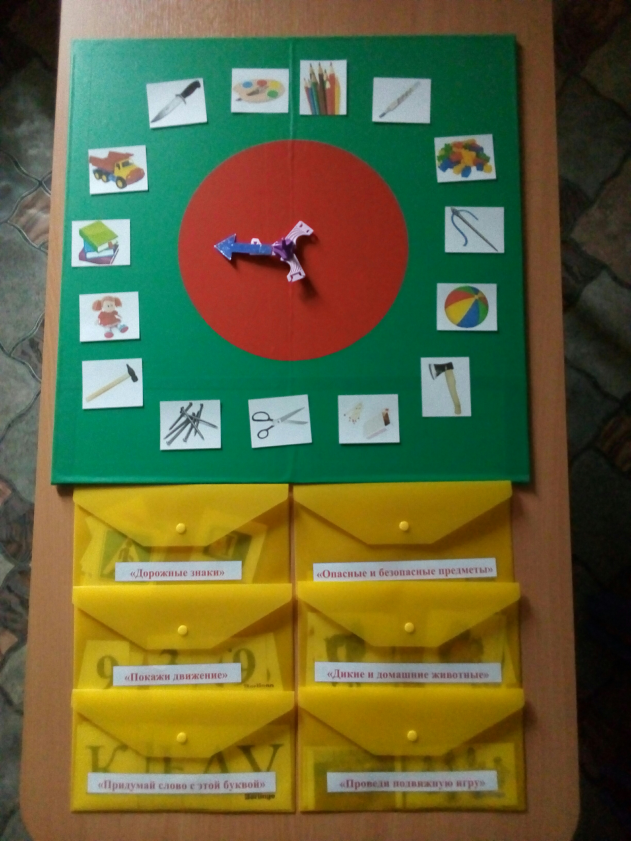 Играющие поочередно раскручивают волчок, забирают с игрового поля карточку, на которую указал волчок, рассказывают об изображенном на ней предмете и кладут в коробочку: в красную – опасный предмет, в зеленую – безопасный.