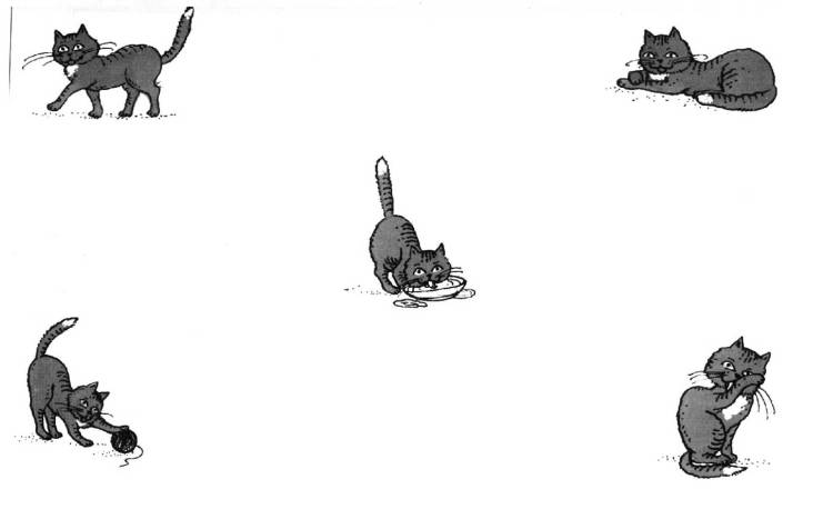 (кошка идет, лежит, лакает, умывается, играет).