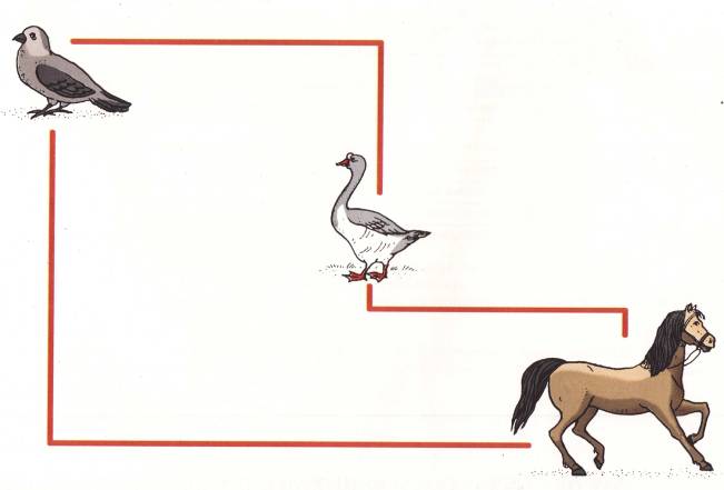 - Гусь идет в гости к лошади. Проводи его пальчиком.
