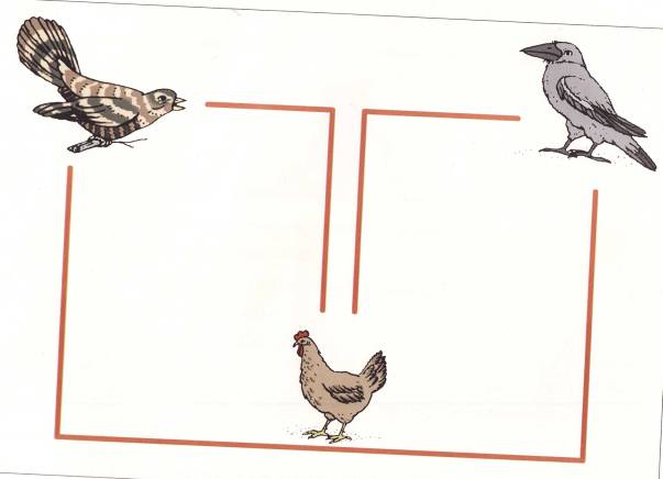 - Проводи курочку к вороне (кукушку к курочке, ворону к кукушке и пр.) Ребенок проводит рукой (пальцем) в заданном направлении от картинки к картинке.