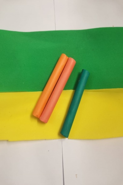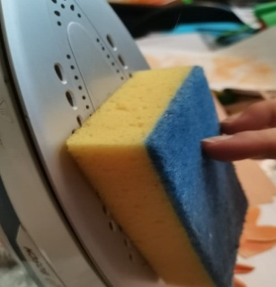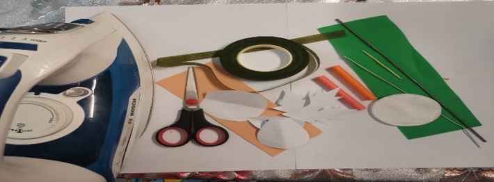 | 1.Для создания цветка из фоамирана нам нужны следующие материалы: фоамиран жёлтого, оранжевого, зеленого цвета, шаблоны, тейп лента, ножницы, зубочистка, пастель, влажный ватный диск или влажные салфетки, проволока, утюг, клеевой пистолет. |