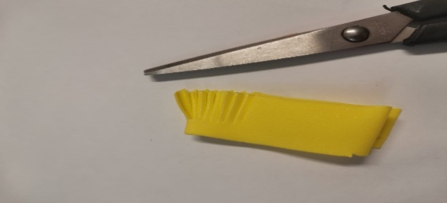 | 2.Обводим по шаблонам детали лепестков и листьев, используя зубочистки. Вырезаем детали цветка. 3.Далее, каждый лепесток с двух сторон тонируем пастелью, который наносим на влажную салфетку и наносим на поверхность. Цвет тонировки зависит от того, какой оттенок вы хотите получить. 4. Из полоски желтого фоамирана сложенным пополам, нарезаем тонкие зубчики-не дорезая до края 0,5 мм. |