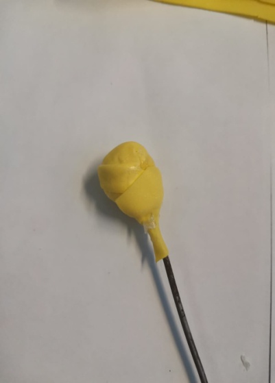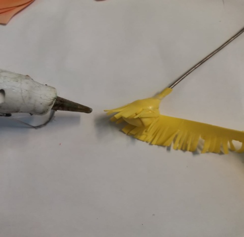 | 5. Сборку цветка начинаем с изготовления серединке (можно использовать готовые пенопластовые детали, пищевую фольгу или же полоску фоамирана скрученную в спираль). Кусочек фольги сминают, придавая форму конуса, закрепляют на проволоку или на шпажку при помощи клеевого пистолета. Стебель цветка обматываем полоской из фоамирана (плотно или свободно). 6.Затем приклеиваем нашу тычинки «оборочку». |