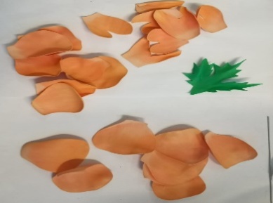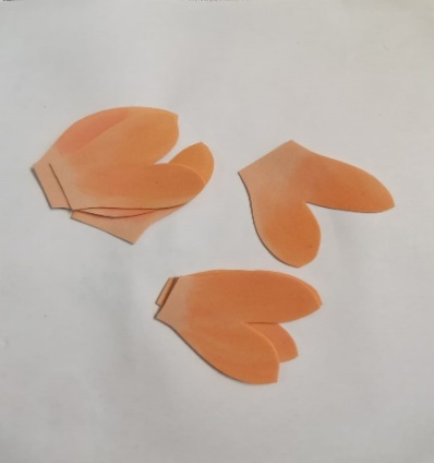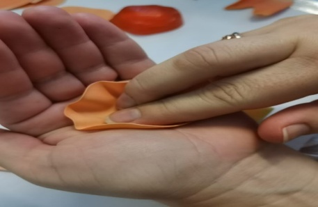 | 7.Вырезанным деталям придаём определённую форму. Верхнюю часть лепестка загибаем во внутрь. Середину лепестка слегка растягивается, до получения желаемый формы.Для придания формы листьев и лепестка можно использовать утюг. |