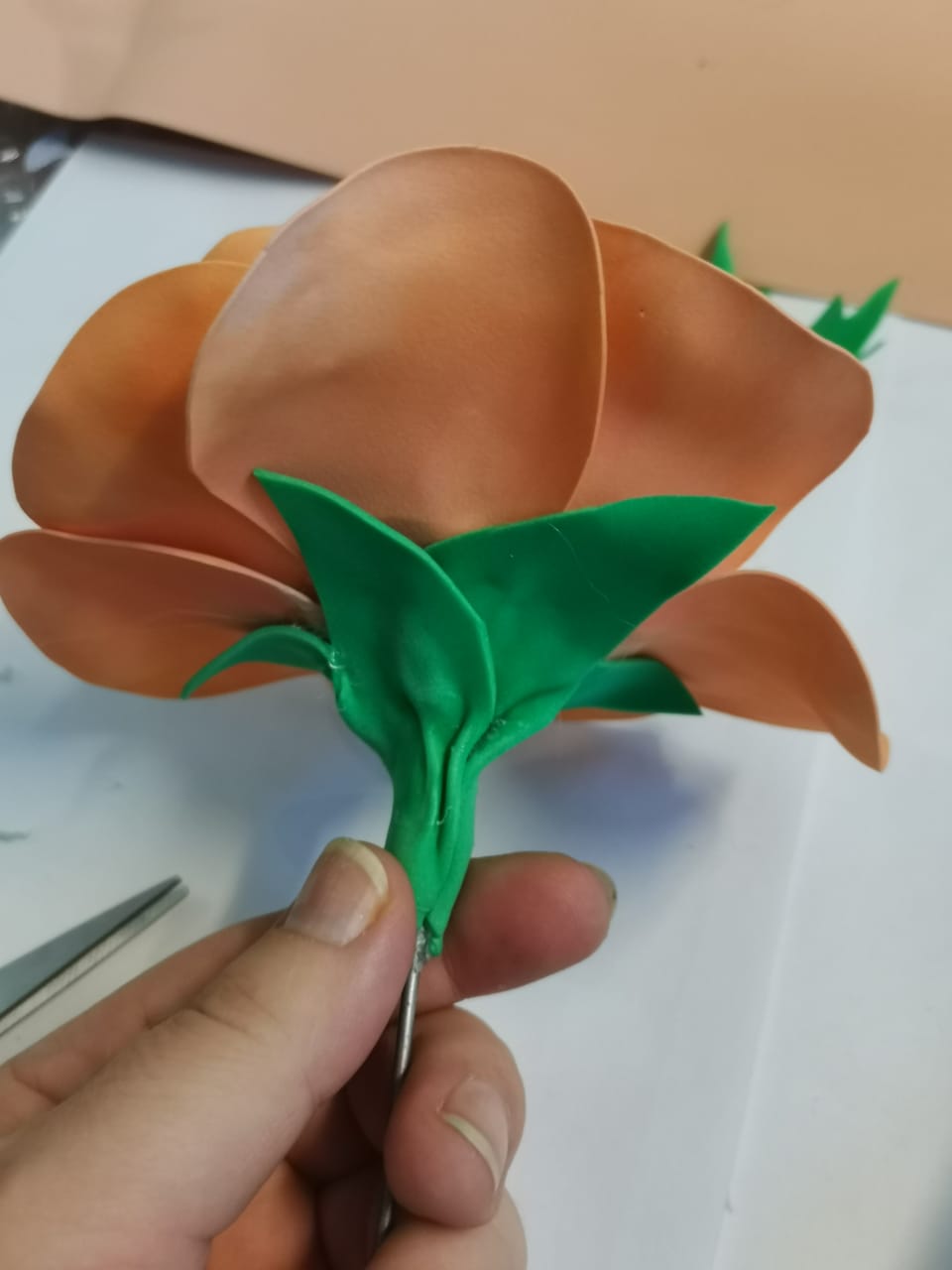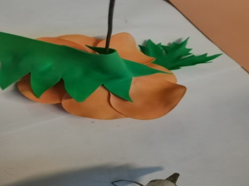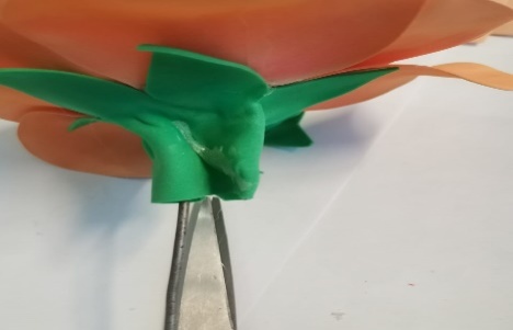 | 10.К готовому цветку приклеиваем чашелистик предварительно придав ему нужную форму. стебель, с помощью клея (пистолета) приклеиваем детали. |