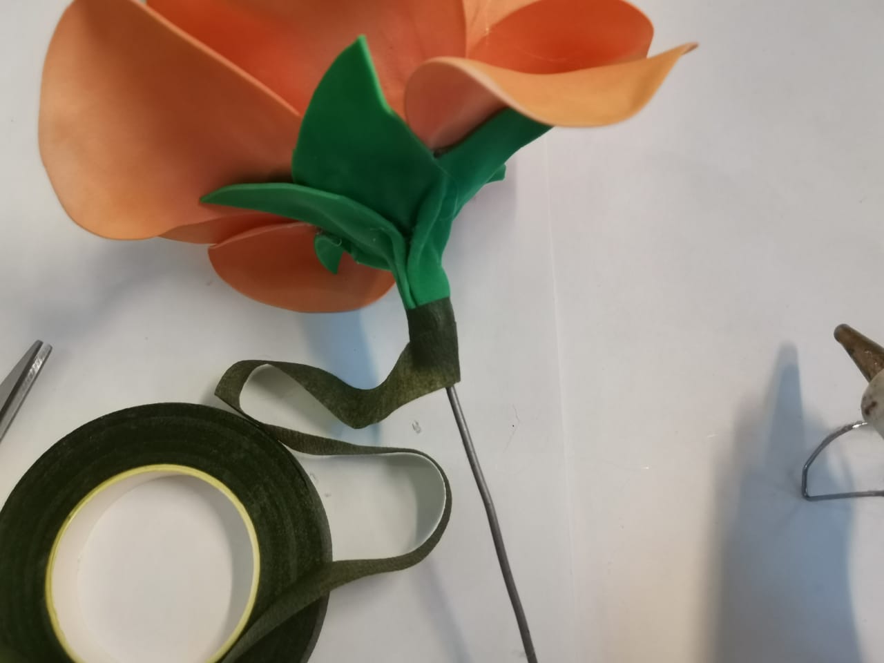 | 11.Стебель и ножку листа, обматываем тейп лентой фиксируя с помощью клея (пистолета). |