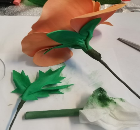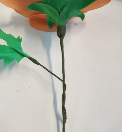 | 12.К стеблю приклеиваем готовые листочки, закрепив их клеем и тейп лентой. |