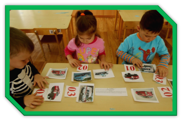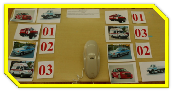 Ход игры: перед ребенком разложены карточки с изображением машин скорой помощи, МЧС, пожарной, полиции, спортивной машины и карточки с номерами 01,02,03. Воспитатель предлагает ребенку позвонить по выбранному номеру и предположить, какая машина приедет.