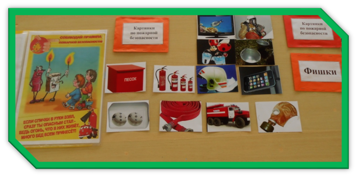 Ход игры: ребёнку предлагается набор предметных карточек, из которых он должен выбрать используемые при тушении пожаров и являющиеся причиной возникновения пожара. Правильно ответивший, получает фишку. Выигрывает игрок, получивший большее количество фишек.