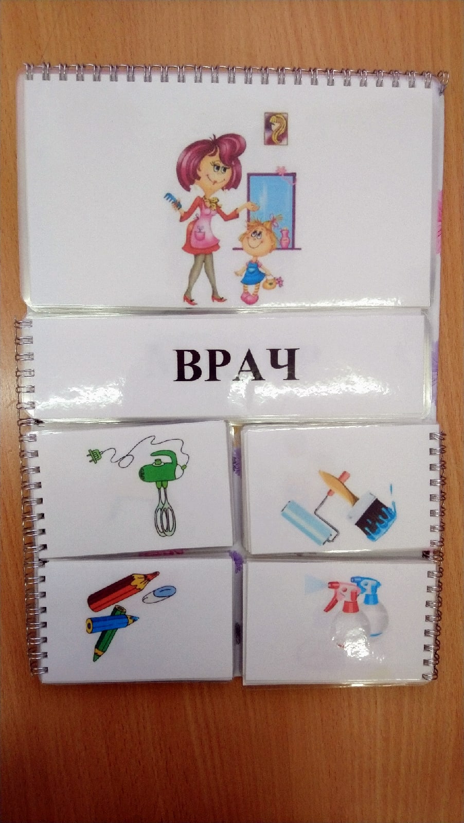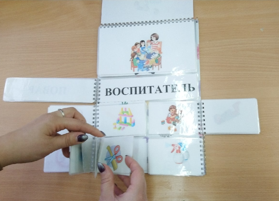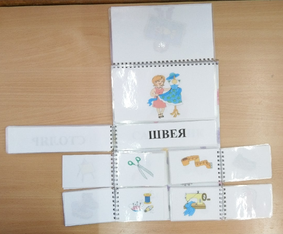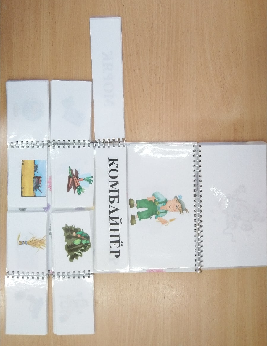 Данная игра представляет собой книгу с картинками (18 профессий), которые несут основную информацию о профессиях. Слова, представленные на карточках, ниже необходимо правильно соотнести с картинкой выше. После подобрать возможные варианты использования предметов к выбранной профессии.