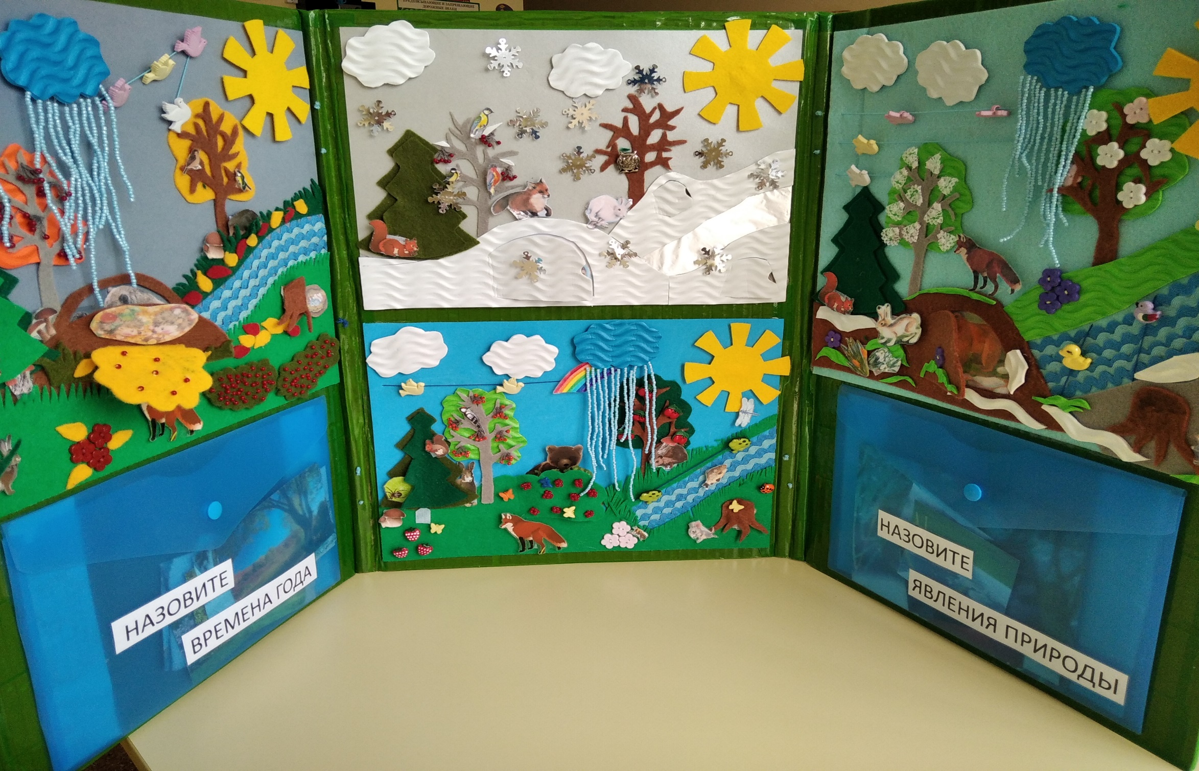 Лэпбук содержит: 4 картины лесного пейзажа (зима, весна, лето, осень) с открывающимися «дверцами», за которыми прячутся медведица с медвежонком, ежик, мышка; с двигающимися по веревочкам птичками и лягушками; с птичками, зверьками, насекомыми, подснежниками и грибами на липучках (можно откреплять и менять местами); с солнцем, облаками, радугой, тучами с дождем, болотом с клюквой и снежинками также на липучках (можно откреплять и менять местами); конверты с картинками «назови времена года» и «назови явления природы»; на обратной стороне - пейзажи русских художников (формата А3).