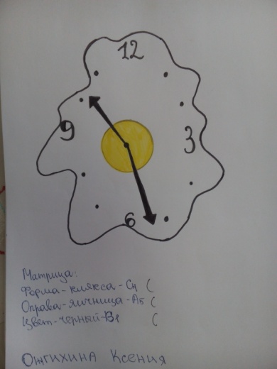 (Например, так для сочетания вариантов получим конструкцию: А1, В1, С1, Д3 - форма часов бесформенная, материал изготовлен из сыр, стрелки у часов из дерева, а форма стрелок бесформенные, и, так далее. Бесконечное дизайнерское воображение для вашего ребенка обеспечено.)