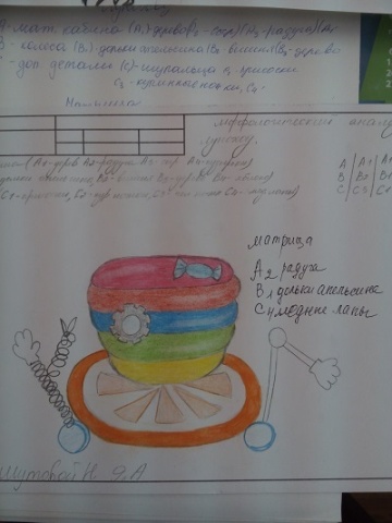 В этой таблице для изделия «часы» выделено 3 признака. Если из каждой строки этой таблицы взять по одному варианту, то получим некоторую матрицу. Так, для сочетания вариантов (А — 1, В—3, С—3, Д—1), где в каждой паре первая цифра означает номер строки, а вторая — номер столбца, получим конструкцию часов: «форма часов бесформенная, материал часов меховой, материал стрелок в виде песка, а форма у стрелок прямая». Можно придумать дополнительную функцию.
