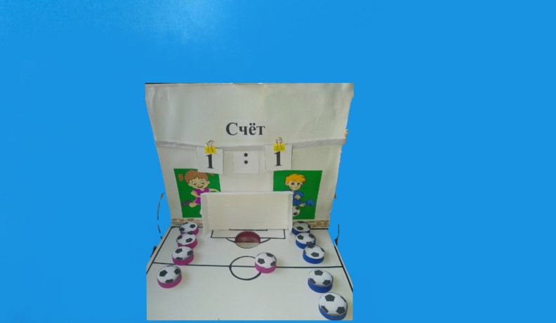 , для данной дидактической игры мне понадобились: коробка от подарочного чая. Убрала все лишнее и обклеила коробку белой бумагой. Распечатала, заламинировала (в домашних условиях утюгом) и наклеила мяч, двух футболистов их я раскрасила, чтобы было интересней, табло для счёта