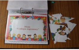 Перед детьми на столе воспитатель кладёт разрезные картинки. Детям участникам игры предлагается сложить картинку из частей так, чтобы получилось, целое изображение, путём накладывания на картинку-основу.