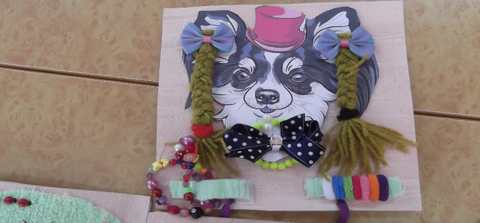 «Наряди собачку» - заплести косичку, завязать резиночки, одеть бусы. Обращаем внимание родителей на то, что необходимо научить ребенка использовать зрение для контроля за своими действиями с предметами, игрушками. Можно предложить все это делать с закрытыми глазами. Сопровождая это все словами «Следи за своими действиями глазами», «Если хочешь, чтобы у тебя получилось красиво, следи внимательно глазами за тем, что делают твои руки». Постепенно он начинает осознавать необходимость зрительно контролировать свои действия. Установка родителей на использование зрительного контроля и словесные описания своих действий, закрепляют зрительные образы, делают их конкретными и запоминающимися.