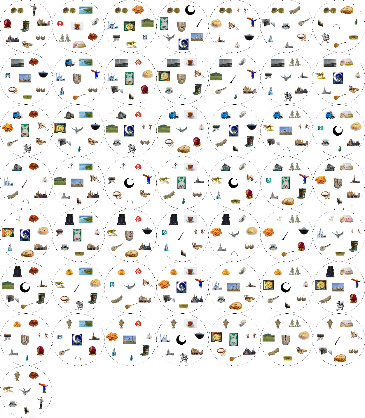 По правилам, на любой паре игровых карточек всегда есть одна и только одна совпадающая картинка. А карточек таких в игре - 57. На каждой по 8 картинок.