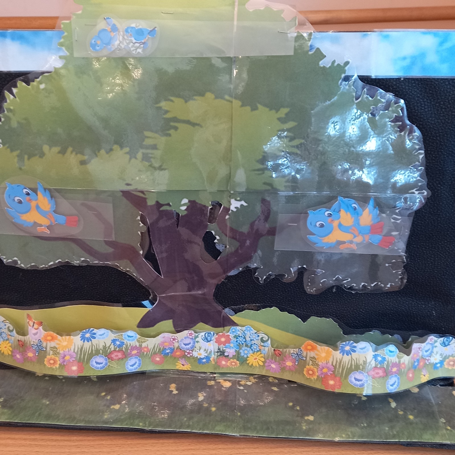 Игровой материал: Панно с изображением дерева; картинки – птички (маленькие и большие); Шапочки для мамы- птички и птенцов.