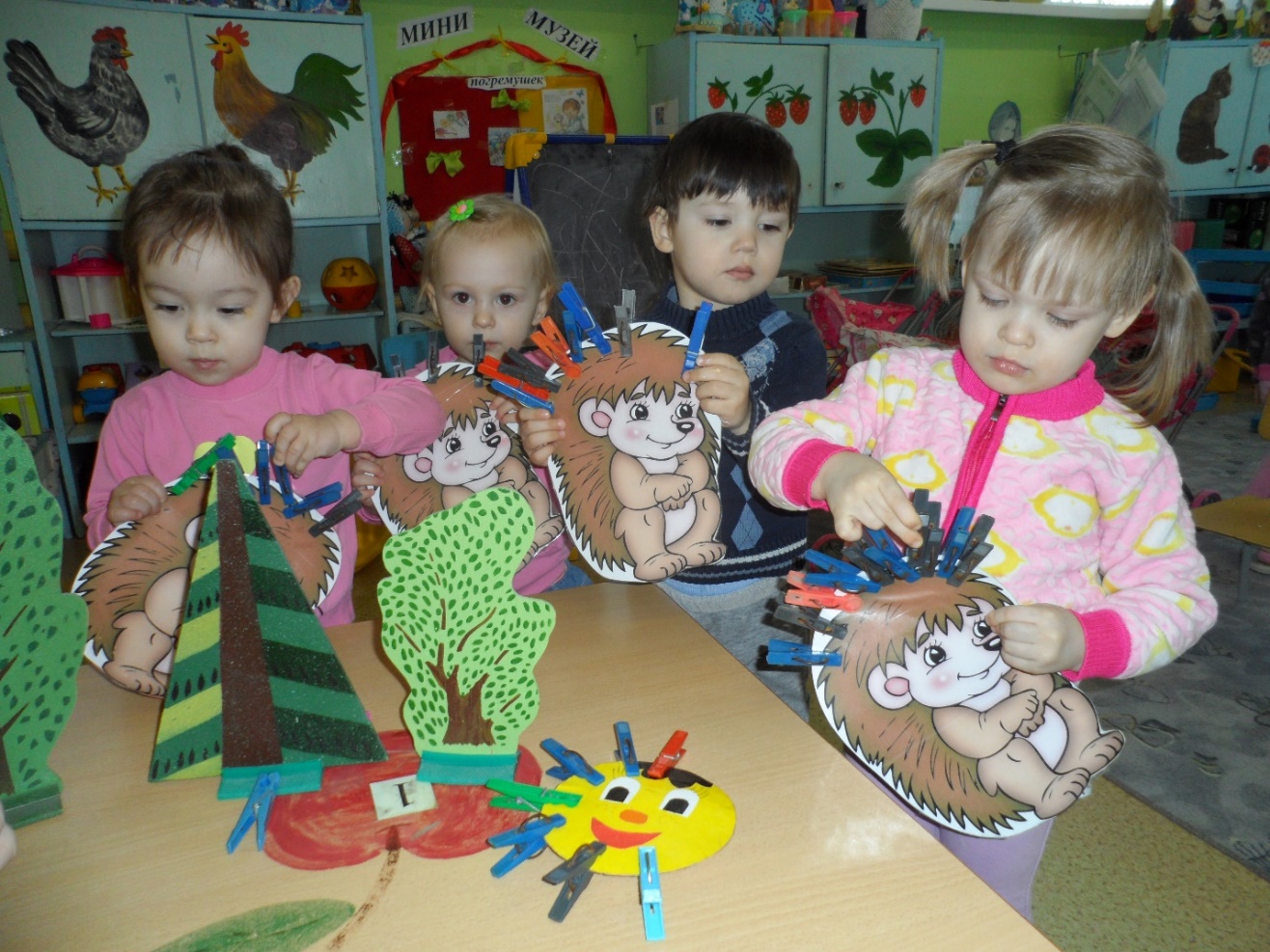 Игра с использованием бельевых прищепок. С помощью прищепок развивается кисть и два пальца руки, которые в дальнейшем будут очень активно задействованы при письме. Помимо развития мелкой моторики, развивается и восприятие цвета, поскольку иголки можно подбирать по цветам, а можно и усложнить, например, подарить красному ёжику жёлтые иголки и т. д.