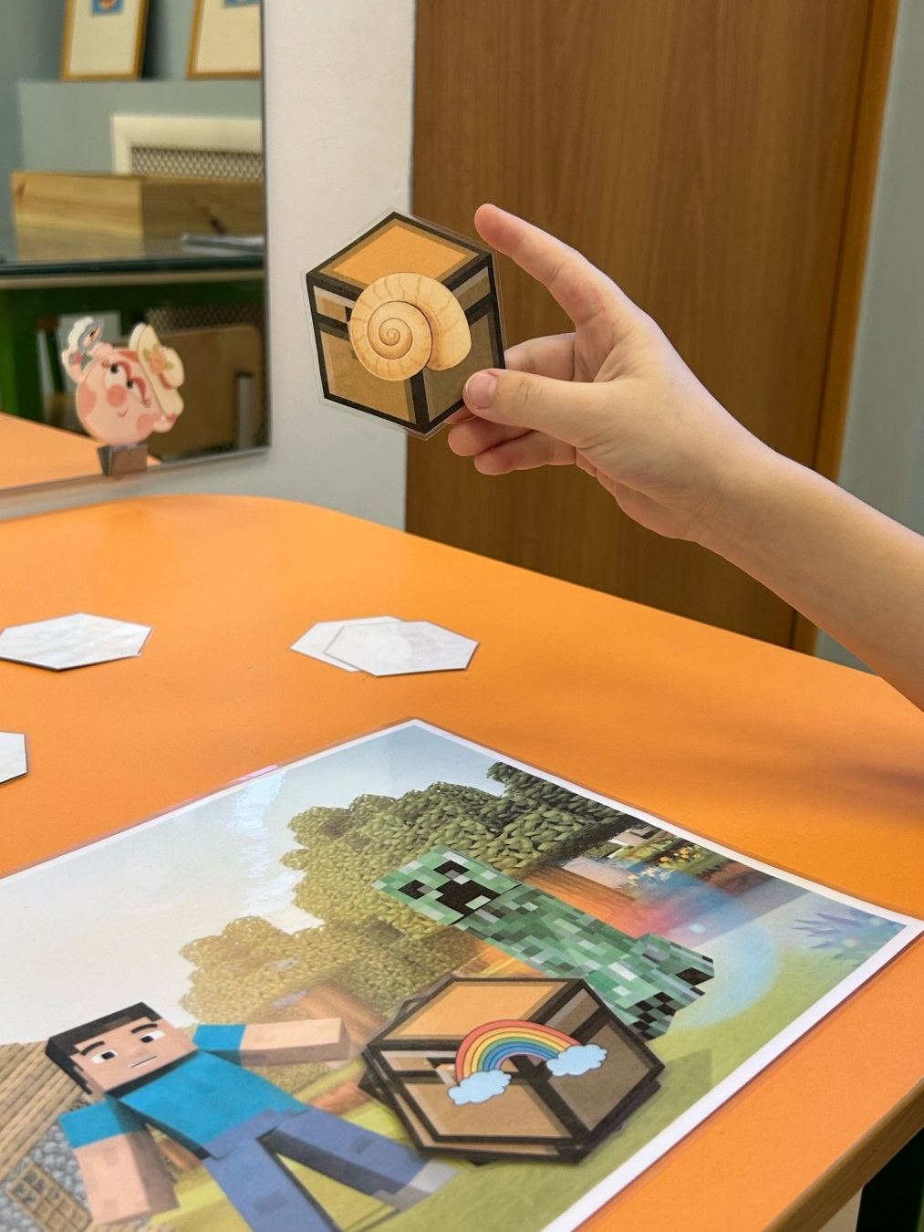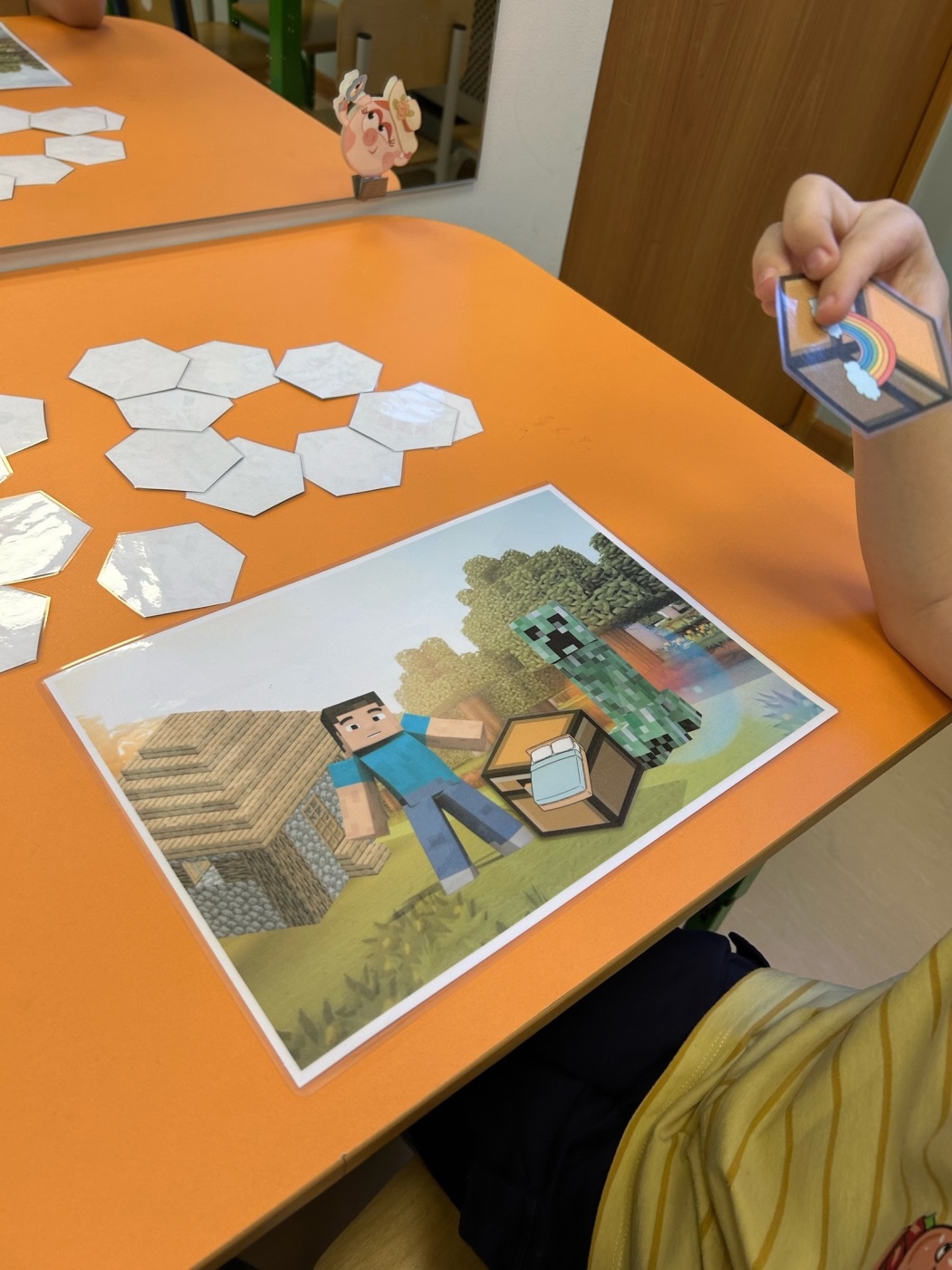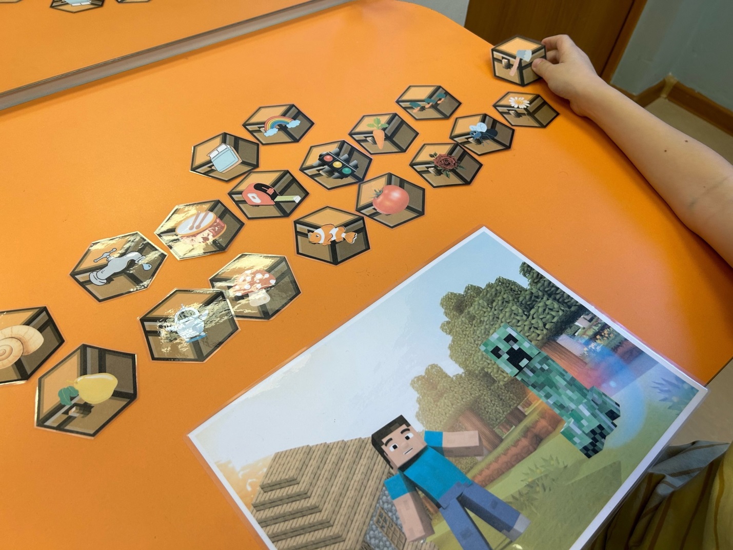 Ход игры: Сегодня мы с тобой отправляемся в мир Майнкрафта, чтобы помочь Стиву. Стив отправил Крипера на чердак, чтобы он навел порядок и принёс нужный инструмент для ремонта. Открывай коробку и отвечай полным предложением: «Крипер открыл коробку с …»