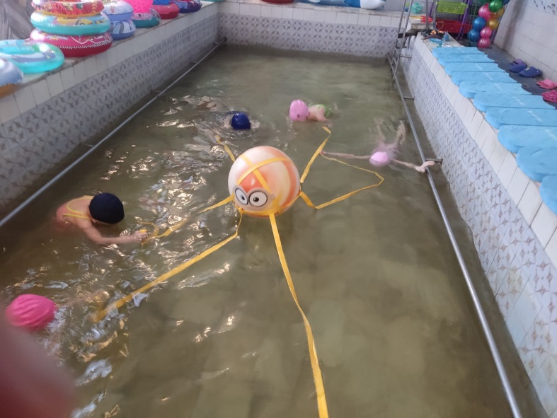 Основным видом деятельности ребенка дошкольного возраста является игра. Игры – это прекрасный способ помочь детям преодолеть страх воды. С новым оборудованием игры в воде становятся более веселыми и безопасными, а дети получают удовольствие от занятий по обучению плаванию. Положительные эмоции, весёлые соревнования, искренний радушный смех, удивление и восторг – важнейшие факторы оздоровления. Новое оборудование помогает разнообразить двигательную активность дошкольников, формировать и совершенствовать двигательные умения и навыки наряду с развитием физических качеств. С использованием оборудования «Миньон осьминог» происходит стимулирование ребенка не просто плавать, а плавать правильно, то есть опускать голову в воду, что позволяет на рефлекторном уровне расслаблять мышцы и вытягивать позвоночник ребенка. Новое нетрадиционное оборудование, повышает эффективность занятии в воде, способствует проявлению активности, самостоятельности и инициативы дошкольников.
