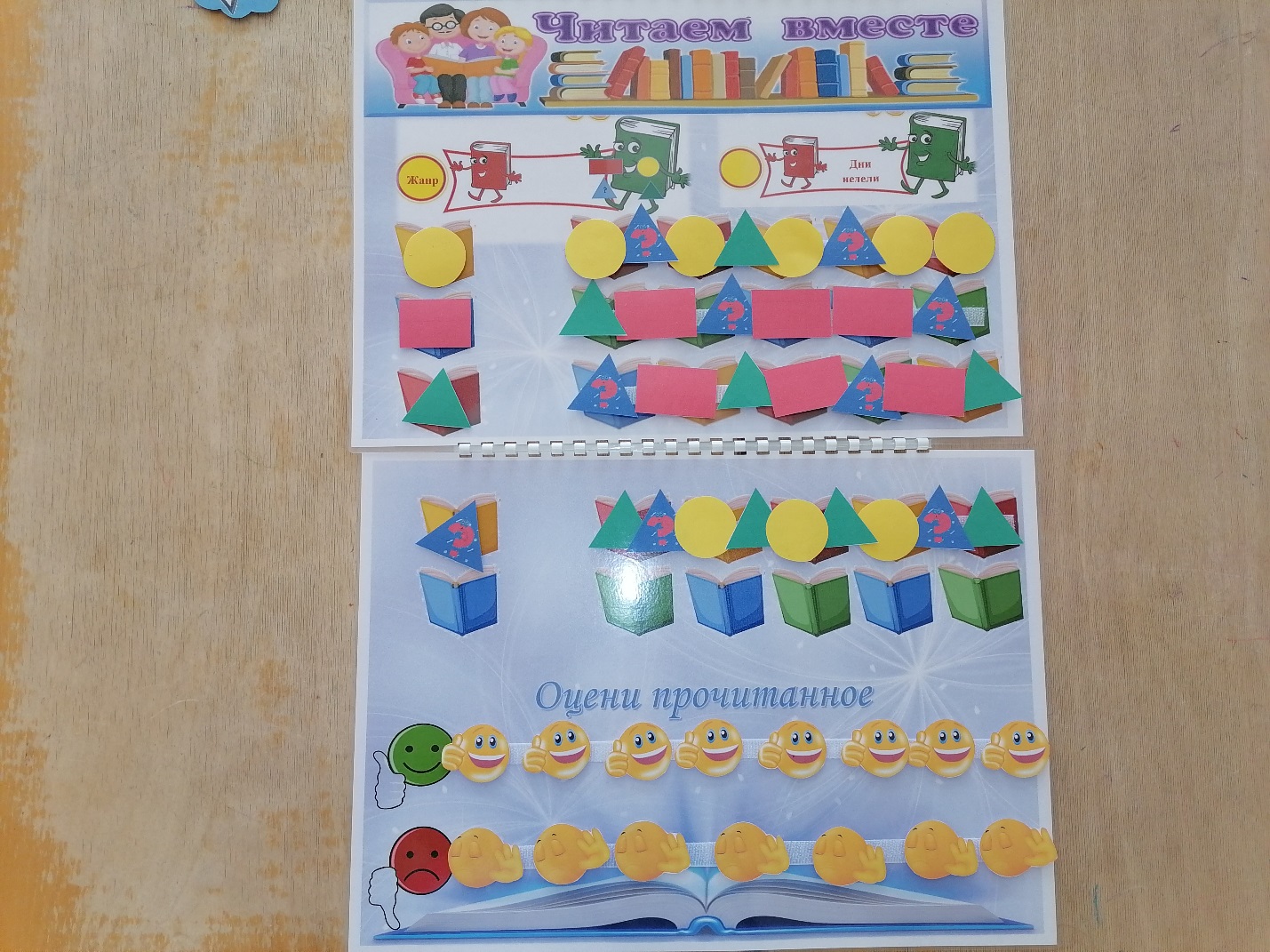 Второй и третий лист — это сам календарь, здесь дети по своему желанию прикрепляют условные знаки (геометр.фигуры, обозначающие жанры литературного произведения), т.е сами принимают решение, а значит чувствуют важность своего решения. Затем мы смотрим, каких знаков больше и выбираем жанр литературного произведения для совместного чтения. После прочтения можем оценить понравилось или не понравилось прочитанное и почему. Пособие с карточками на липучках, которое выполняет функции обычного адвент-календаря. Но вместо записей используются картинки (условные знаки). Экран можно использовать для того чтобы педагог совместно с детьми могли спланировать свои занятия на 1 день или на целую тематическую неделю.