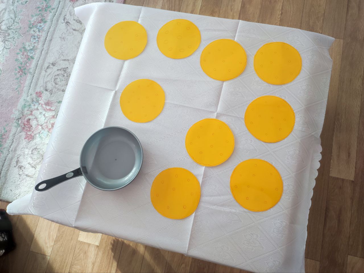 Разместите блинчики в куче на полу или на столе.