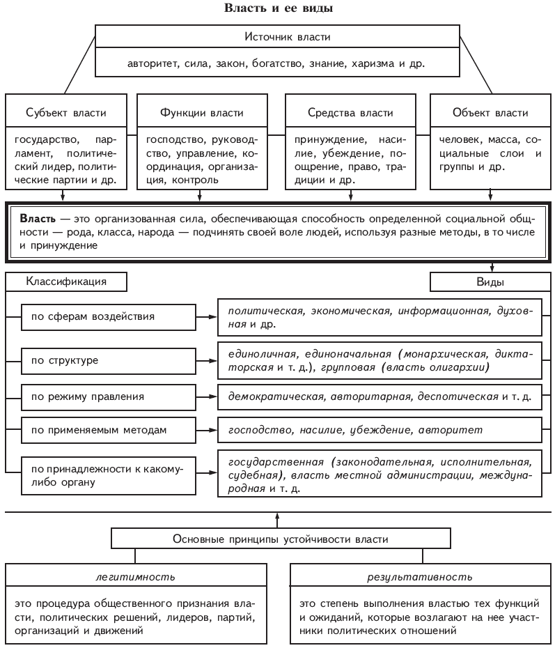 Власть есть особые отношения между субъектом и объектом. Субъект – носитель власти: господствует, управляет, принимает решения и обеспечивает их выполнение. Он диктует свою волю объекту и побуждает его повиноваться. С помощью авторитета, убеждения, стимулирования или принуждения реализует свои цели и интересы.