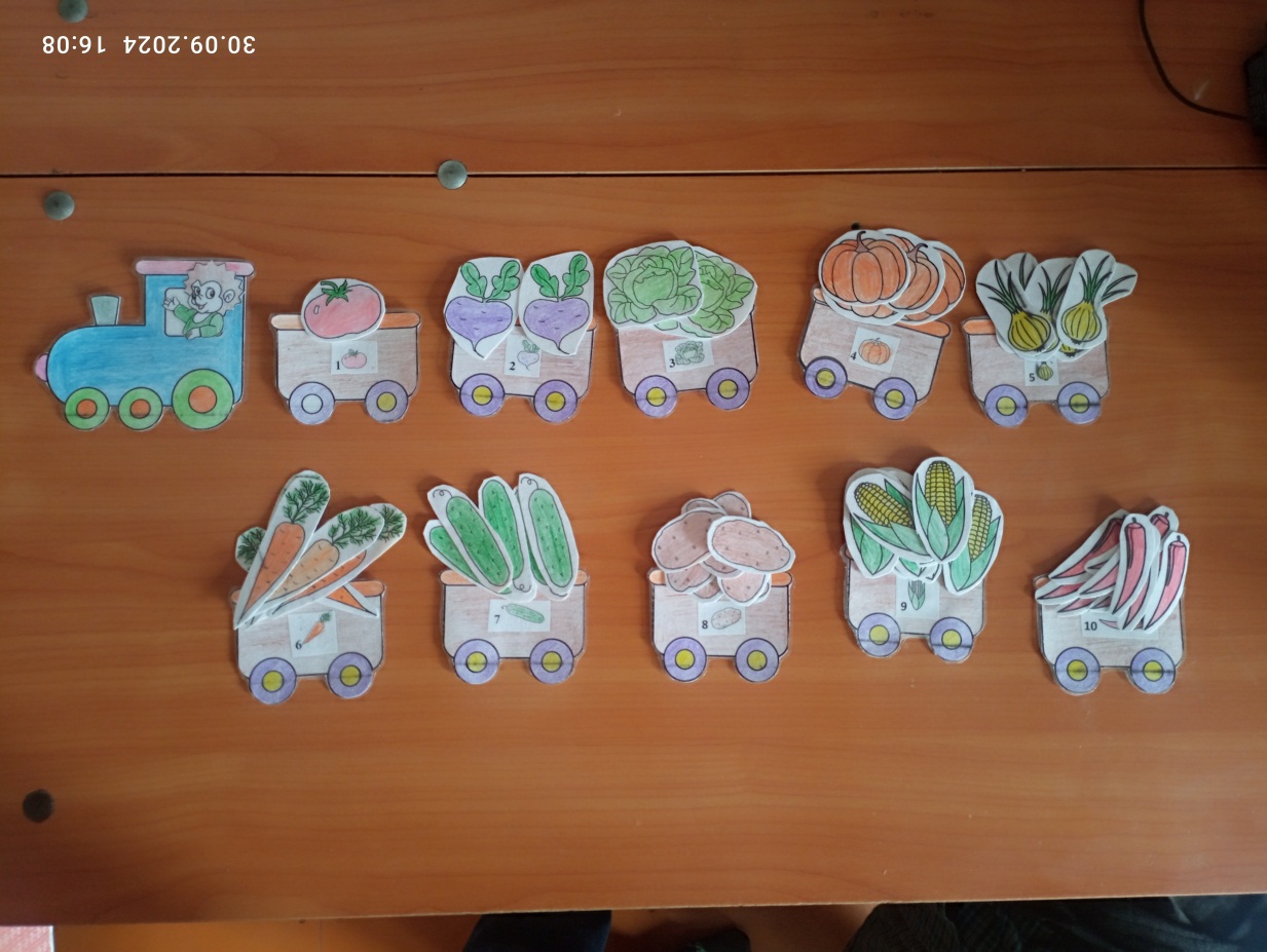 Материал для игры:паровоз, 10 пронумерованных вагонов, картинки овощей (помидор, огурцы, перцы, лук, тыквы, картошка, капуста, свекла, морковь, кукуруза).