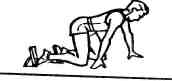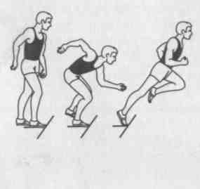 По команде «На старт!» бегун занимает исходное положение у стартовой линии. Толчковая нога находится у линии, а маховая нога ставится на 2 —2,5 стопы сзади. Туловище наклонено вперед примерно на 40 — 45°, ноги согнуты в тазобедренных и коленных суставах, ОЦМ (общий центр массы) расположен ближе к впередистоящей ноге. Положение тела бегуна должно быть удобным и устойчивым. Руки согнуты в локтевых суставах и занимают противоположное положение ногам. Взгляд бегуна направлен вперед на дорожку, примерно на 3 — 4 м (рис).
