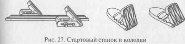 В беге на короткие дистанции, согласно правилам соревнований, применяется низкий старт, используя при этом стартовые колодки (станки) (рис. 27).