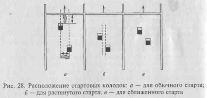 Приобычном старте расстояние от стартовой линии до первой колодки 1,5 — 2 стопы, такое же расстояние от первой до второй колодки. Для начинающих спортсменов можно применять расстановку по длине голени, т.е. расстояние до первой колодки и от первой до второй равно длине голени.