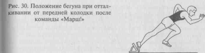 Услышав стартовый сигнал (выстрел, команда голосом), бегун мгновенно начинает движение вперед, отталкиваясь руками от дорожки с одновременным отталкиванием сзади стоящей ноги от задней колодки. Далее вместе с маховым движением вперед сзади стоящей ногой начинается отталкивание от колодки впереди стоящей ноги, которая резко разгибается во всех суставах (рис. 30). Обычно руки работают разноименно, но некоторые тренеры предлагают начинать движения руками одноименно и с частотой выше, чем частота ног. Это делается для того, чтобы бегун активно выполнял шаги на первых метрах дистанции, особенно первый шаг. Угол отталкивания с колодок у квалифицированных бегунов колеблется от 42 до 50°.