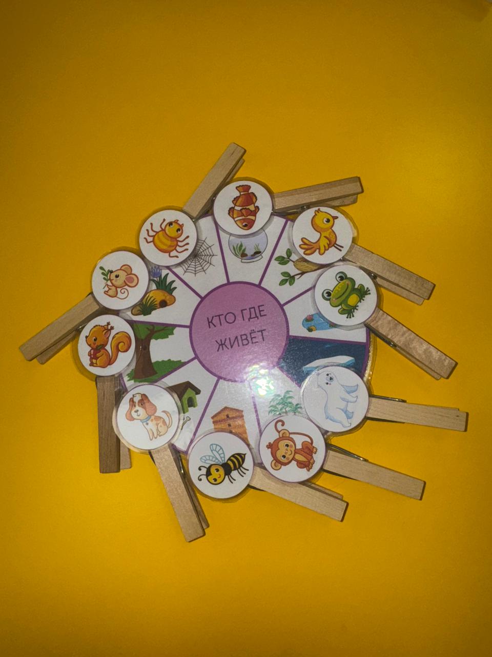 3. Ребенок находит карточку с местом обитания, подходящую животному, и прикрепляет ее прищепкой к карточке с животным.