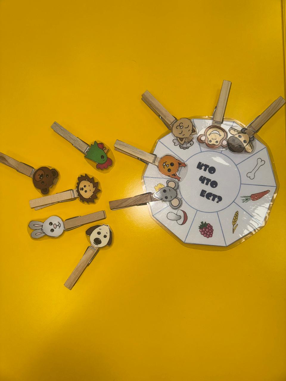 3. Ребенок находит карточку с едой, подходящую животному, и прикрепляет ее прищепкой к карточке с животным.