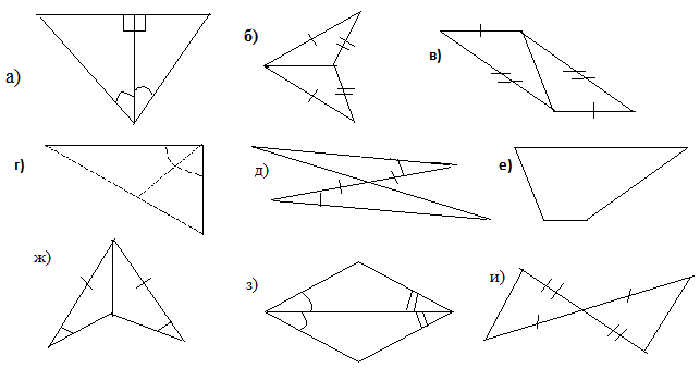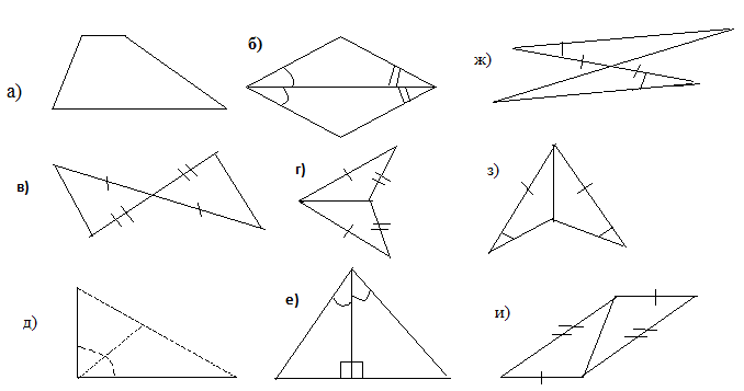 1) равные стороны; 2) равные стороны и углы; 3) равные углы.