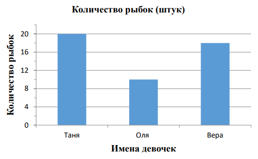 Дима предложил Оле и её подругам Тане и Вере, которым недавно тоже купили аквариумы, завести мелких рыбок, длина которых составляет от 20 мм до 25 мм. Этих рыбок обычно держат в аквариуме стаями по несколько штук, чтобы им не было скучно. Каждая из девочек купила несколько мелких рыбок породы «вишневый барбус» для своего аквариума. Количество рыбок у каждой девочки показано на следующей диаграмме.