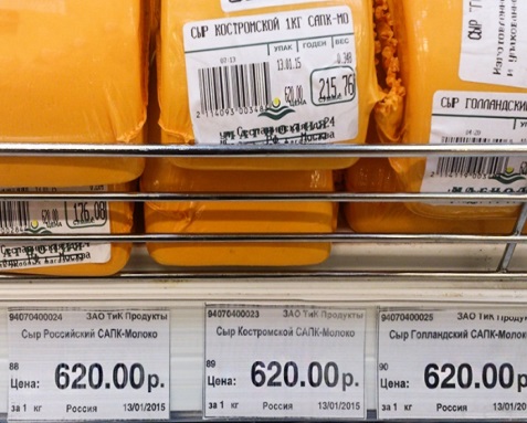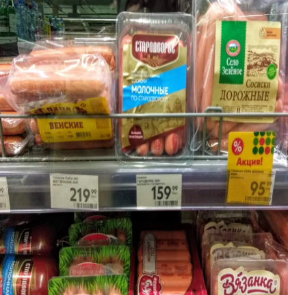 Prices in the food store: Sаusages: Dorognye -95 rub Venskie- 219 rub Molochnie- 159 rub Cheese: Kostromskoi- 620 rub/kg Rossiyskuy- 620 rub/kg Golandskii- 620 rub/kg Pasta: Barrilla -79 rub Maltagliati-81 rub | Ingredients