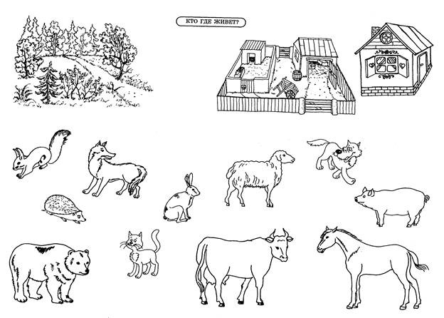 | «Кто где живёт?» Возраст: 2-3 года Цель: создание условий для освоения детьми элементарных знаний о диких и домашних животных. Материалы: карточки с изображением животных (домашних и диких) и две большие карточки одна с изображением леса, вторая с изображением дома (фермы). Действия:воспитатель раскладывает перед ребенком карточки с изображениями мест обитания и животных, предлагает ребенку соотнести их. |