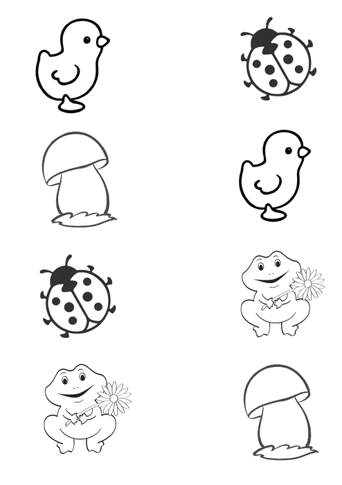 «Парные картинки» Возраст: 3-4 года Цели: учить находить одинаковые изображения; развивать внимание. Материалы: два набора карточек с изображениями знакомых детям игрушек или предметов. Действия: игра проводиться индивидуально. на столе перед ребенком раскладываем в ряд набор картинок. Показываем ему карточку из другого комплекта и просим подобрать картинке пару. В случае затруднения демонстрируем малышу, как можно подобрать картинку, подкладывая ее поочередно к каждой карточке в ряду, пока не найдёт такую же. Затем предлагаем ребенку другую картинку. Количество картинок можно постепенно увеличить с 2 – 3 до 4 – 6 пар. При игре с группой детей даём каждому ребенку картинку и просим подобрать ей пару среди карточек, перемешанных на столе. |