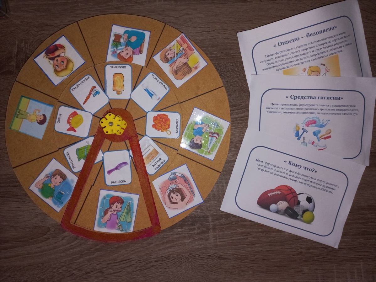 Ход игры: Воспитанники рассматривают картинки с предметами гигиены на малом круге. Затем с помощью стрелки соотносят их с действиями детей, связанными с культурно-гигиеническими навыками на большом круге.